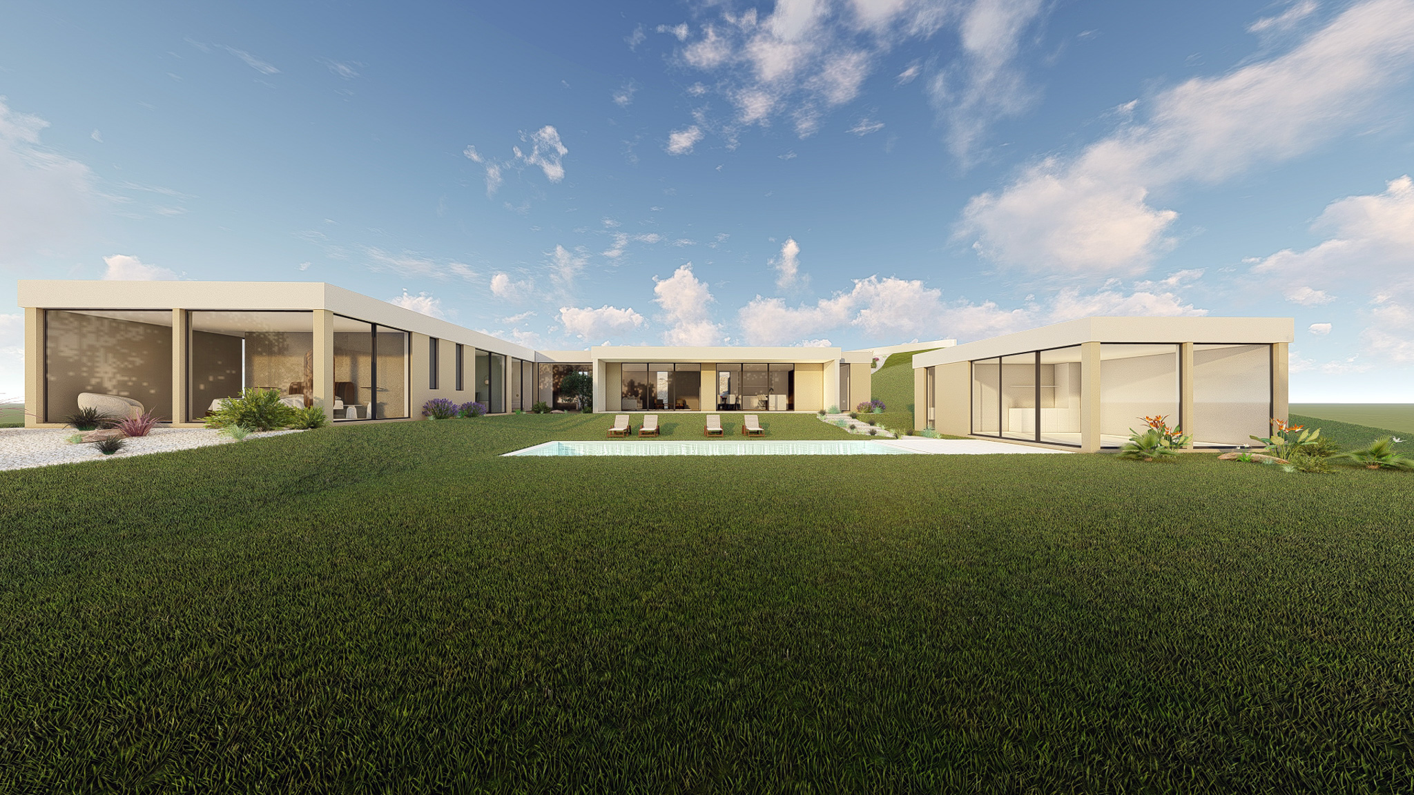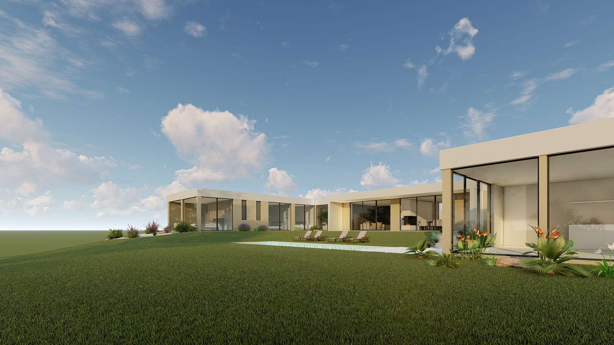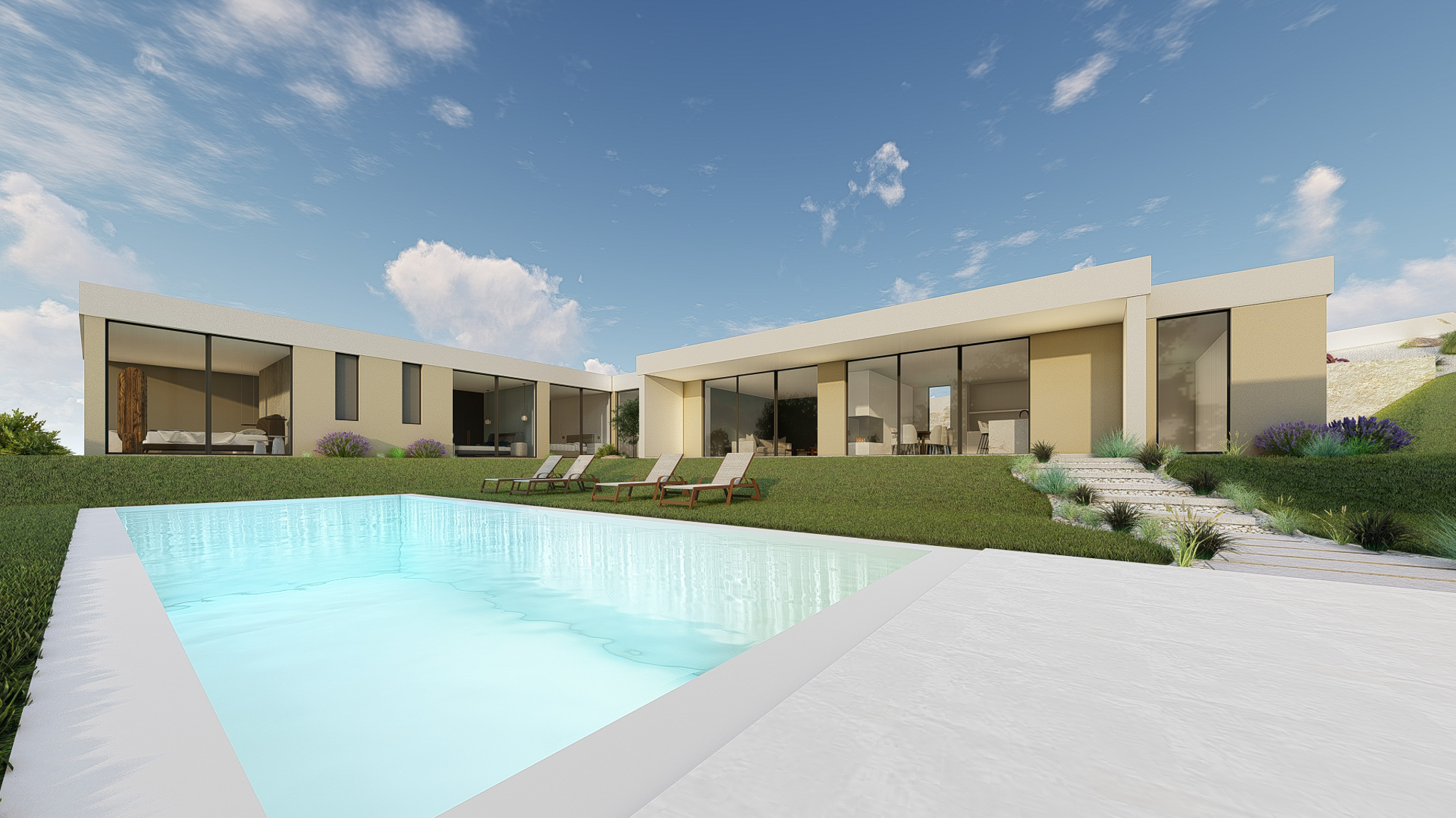 O projeto tira partido do ligeiro declive do terreno, adaptando-se à topografia e permitindo uma implantação fluida que valoriza a vista e a exposição solar. A linguagem material baseia-se numa paleta de tons claros e neutros, onde o reboco em bege suave e as superfícies envidraçadas se articulam de forma contínua, permitindo que a luz natural e a paisagem definam o ambiente interior. Os reflexos da água da piscina e o jogo de sombras projetado pelos volumes reforçam a sensação de leveza e serenidade, traduzindo uma arquitetura de equilíbrio e harmonia entre forma, matéria, luz e terreno.
