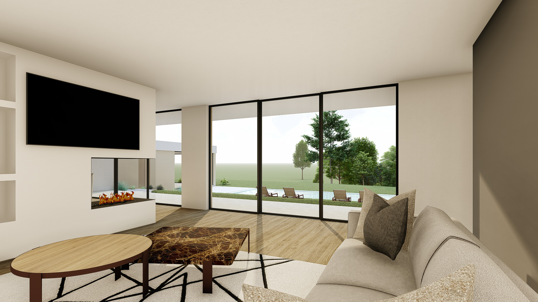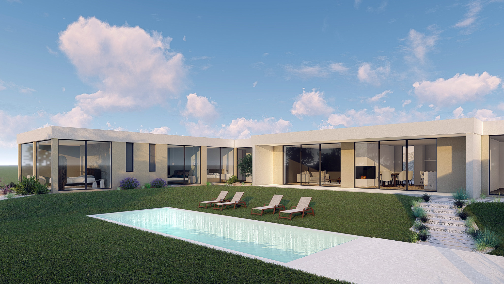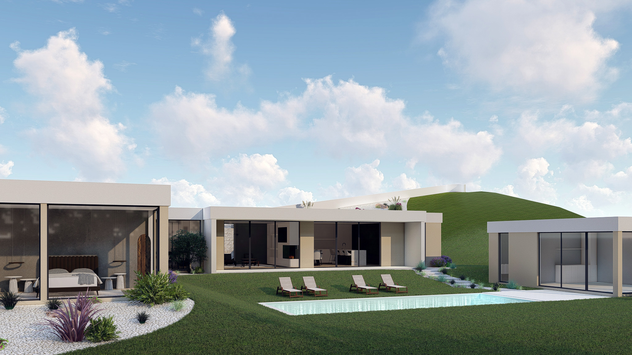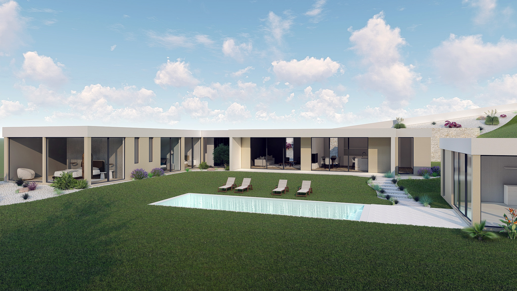 O projeto tira partido do ligeiro declive do terreno, adaptando-se à topografia e permitindo uma implantação fluida que valoriza a vista e a exposição solar. A linguagem material baseia-se numa paleta de tons claros e neutros, onde o reboco em bege suave e as superfícies envidraçadas se articulam de forma contínua, permitindo que a luz natural e a paisagem definam o ambiente interior. Os reflexos da água da piscina e o jogo de sombras projetado pelos volumes reforçam a sensação de leveza e serenidade, traduzindo uma arquitetura de equilíbrio e harmonia entre forma, matéria, luz e terreno.