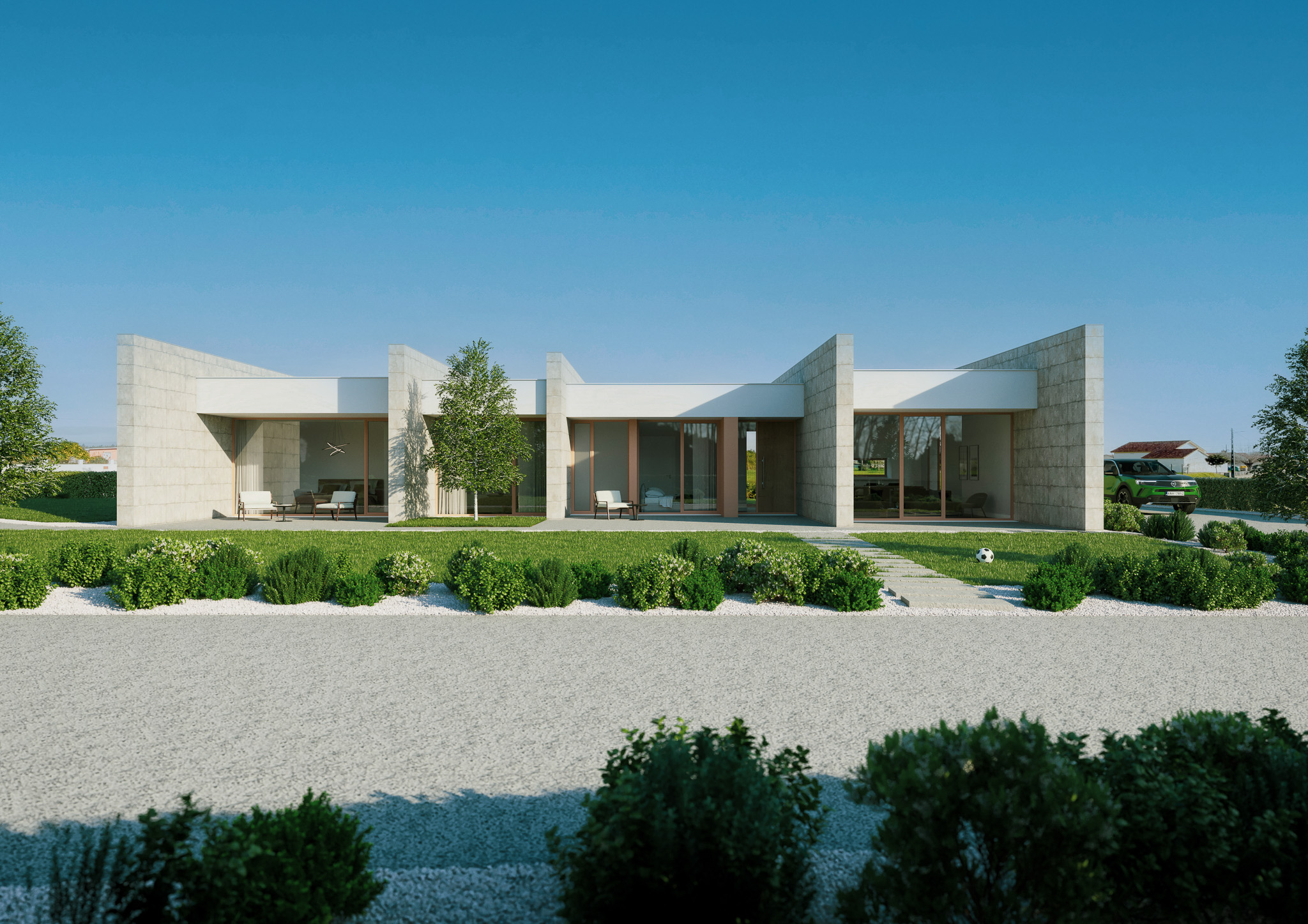 A Casa na Espinheira parte do gesto primordial de erguer paredes revestidas em pedra, dispostas transversalmente e elevadas acima da cota da cobertura. Estas lâminas definem o ritmo do volume e criam uma relação dinâmica entre cheios e vazios, luz e sombra, transparência e massa.