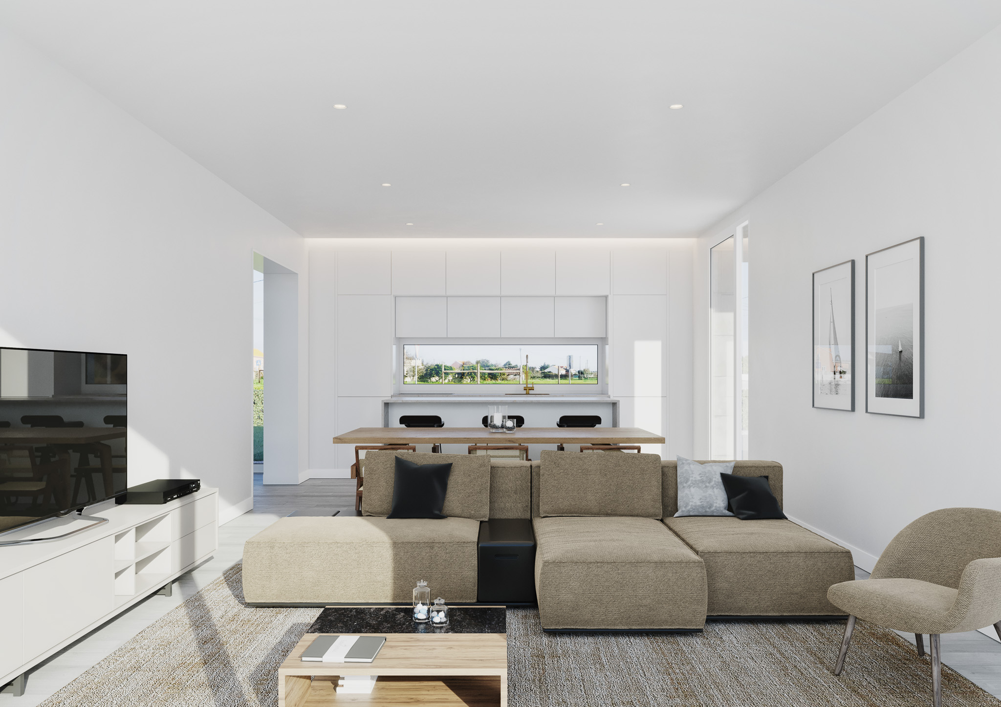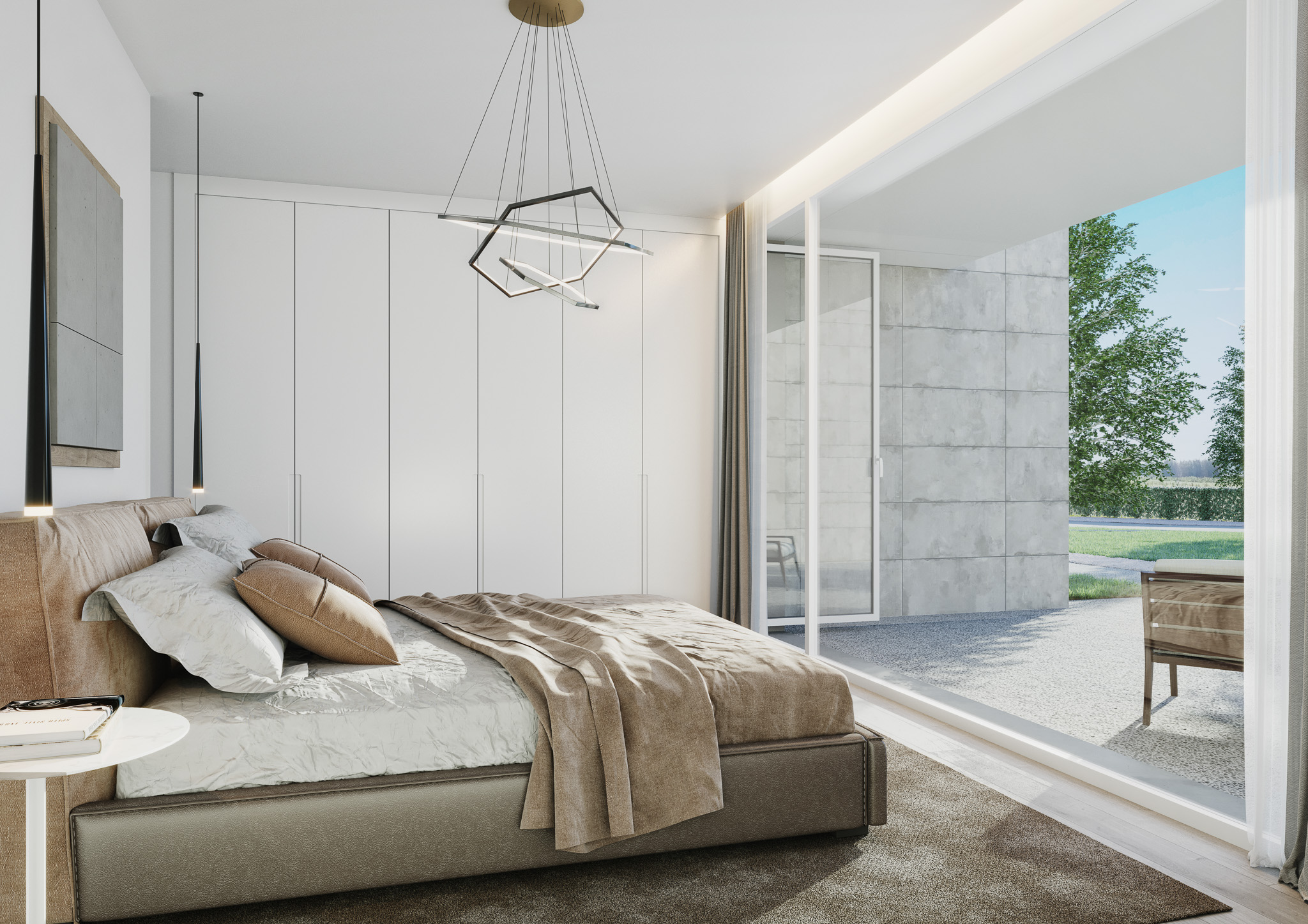 Entre estas paredes, a habitação desenvolve-se num único piso, privilegiando a continuidade visual e física entre interior e exterior. Grandes vãos envidraçados permitem a entrada de luz natural e a extensão dos espaços de estar para o jardim envolvente.