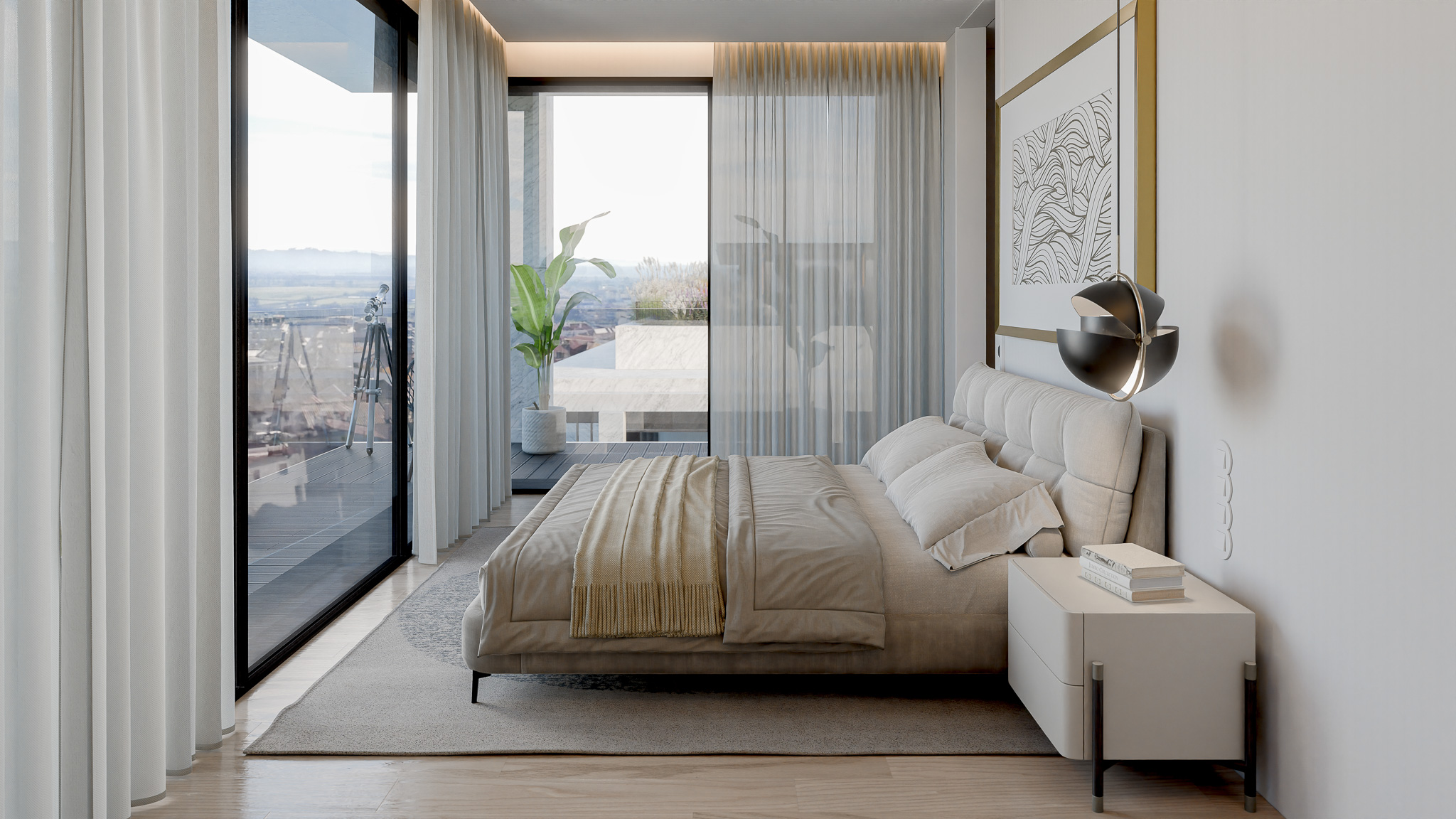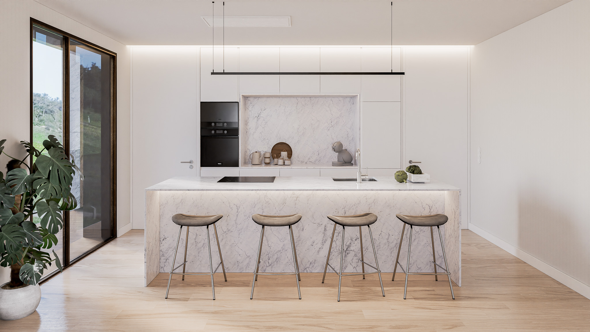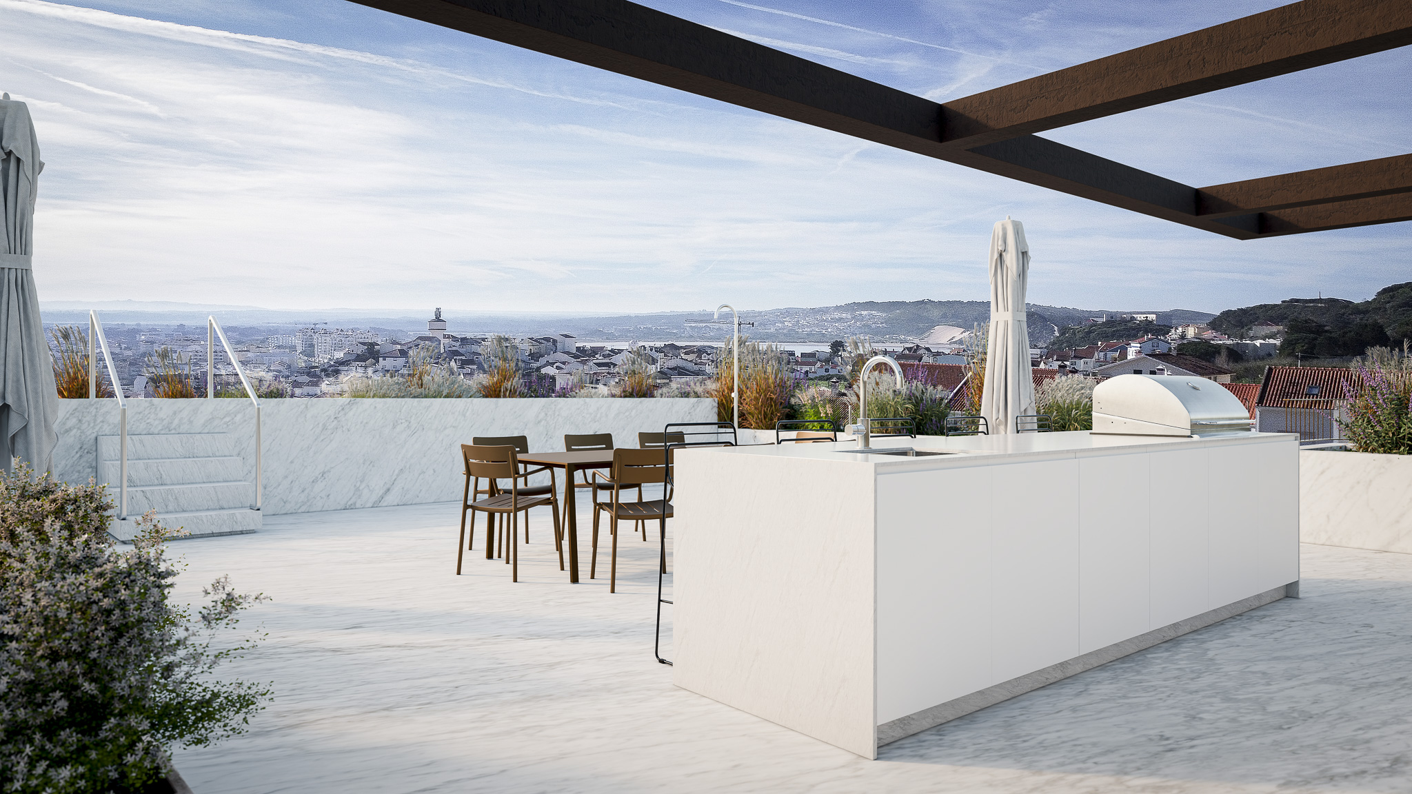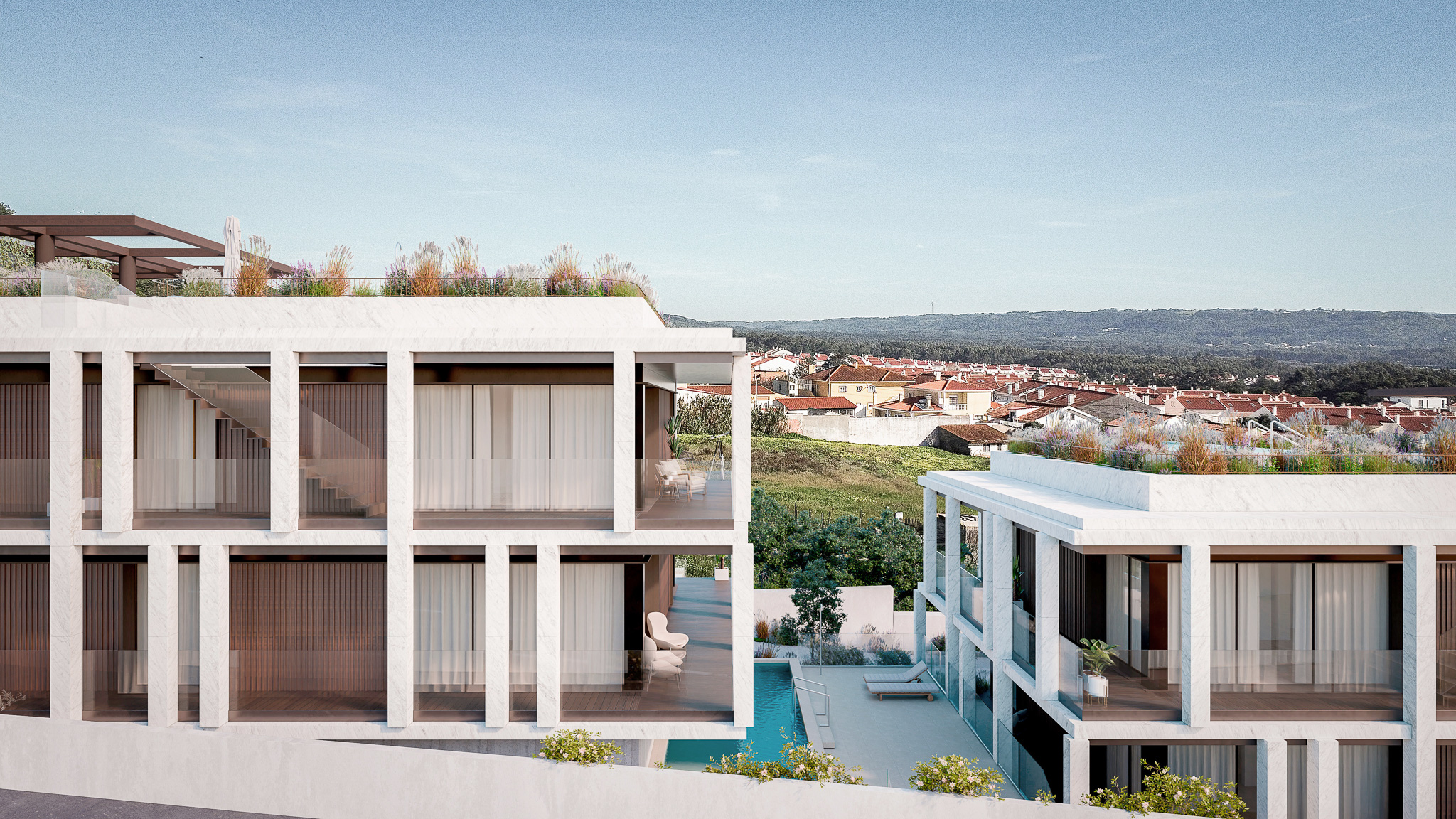 A expressão arquitetónica assenta na proporção e na clareza estrutural, com fachadas revestidas a mármore de acabamento jato de areia e varandas em madeira escura que introduzem contraste e temperatura aos planos negativos. O conjunto integra cinco piscinas – quatro privadas nos terraços e uma comum ao nível do logradouro – que prolongam o espaço habitacional para o exterior, reforçando a qualidade de vida e a ligação visual com a natureza.