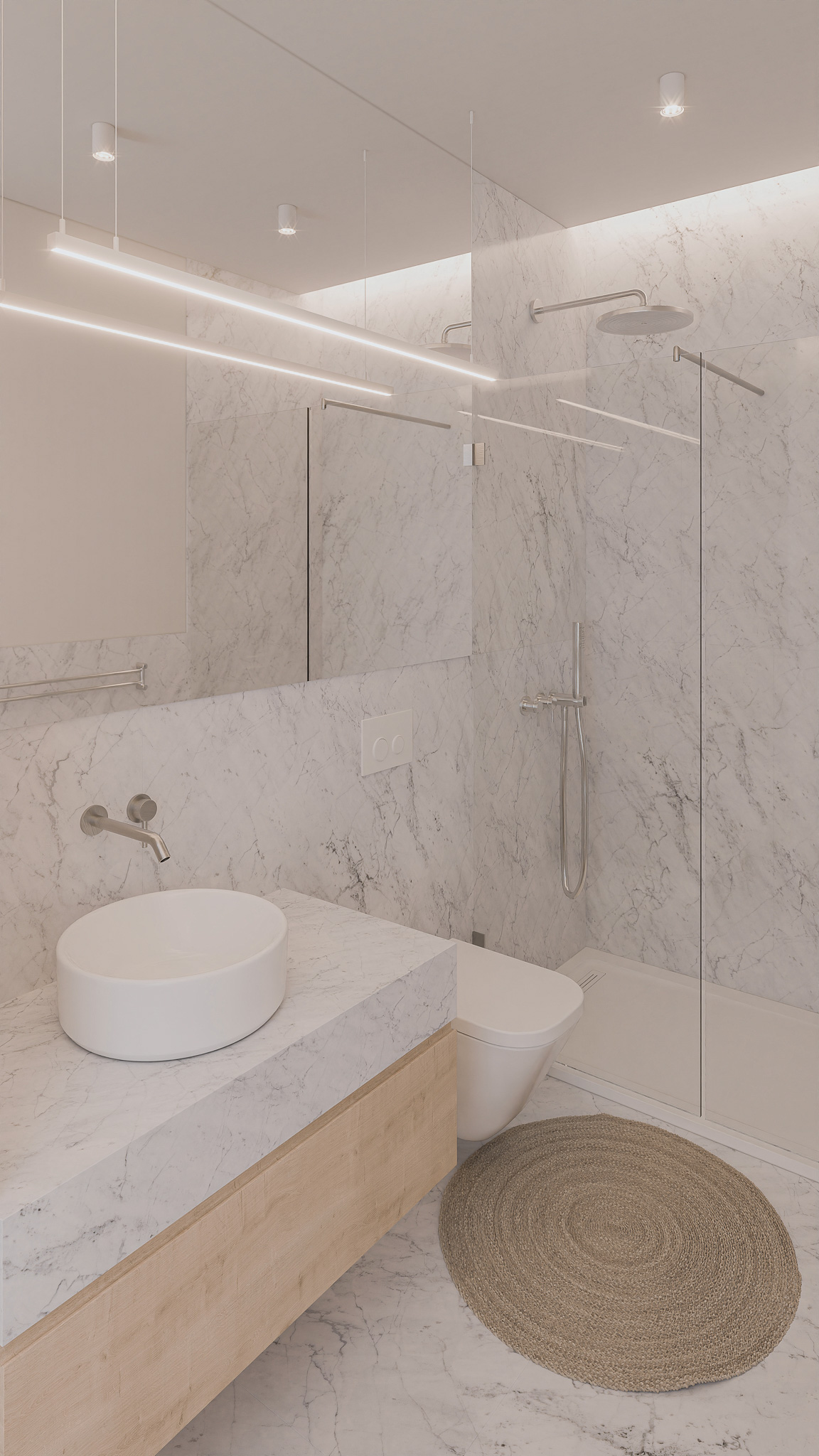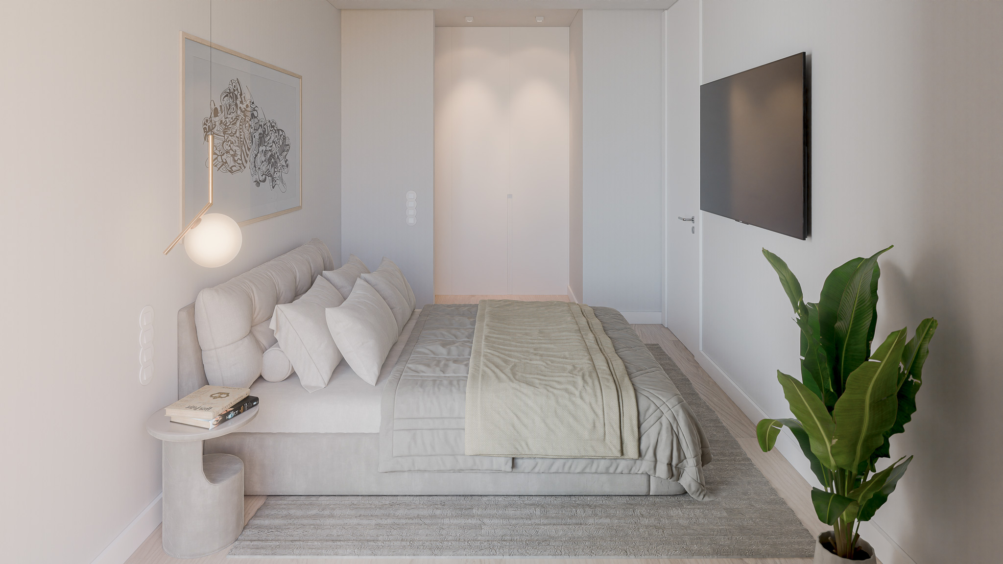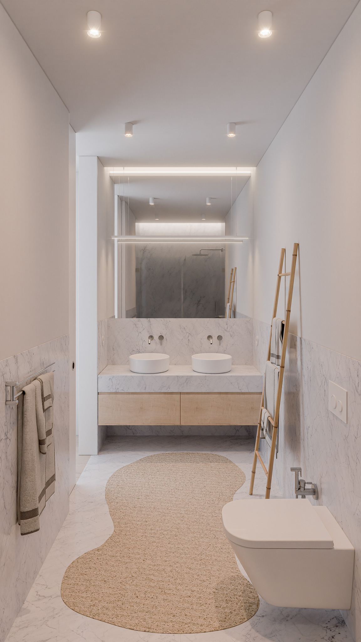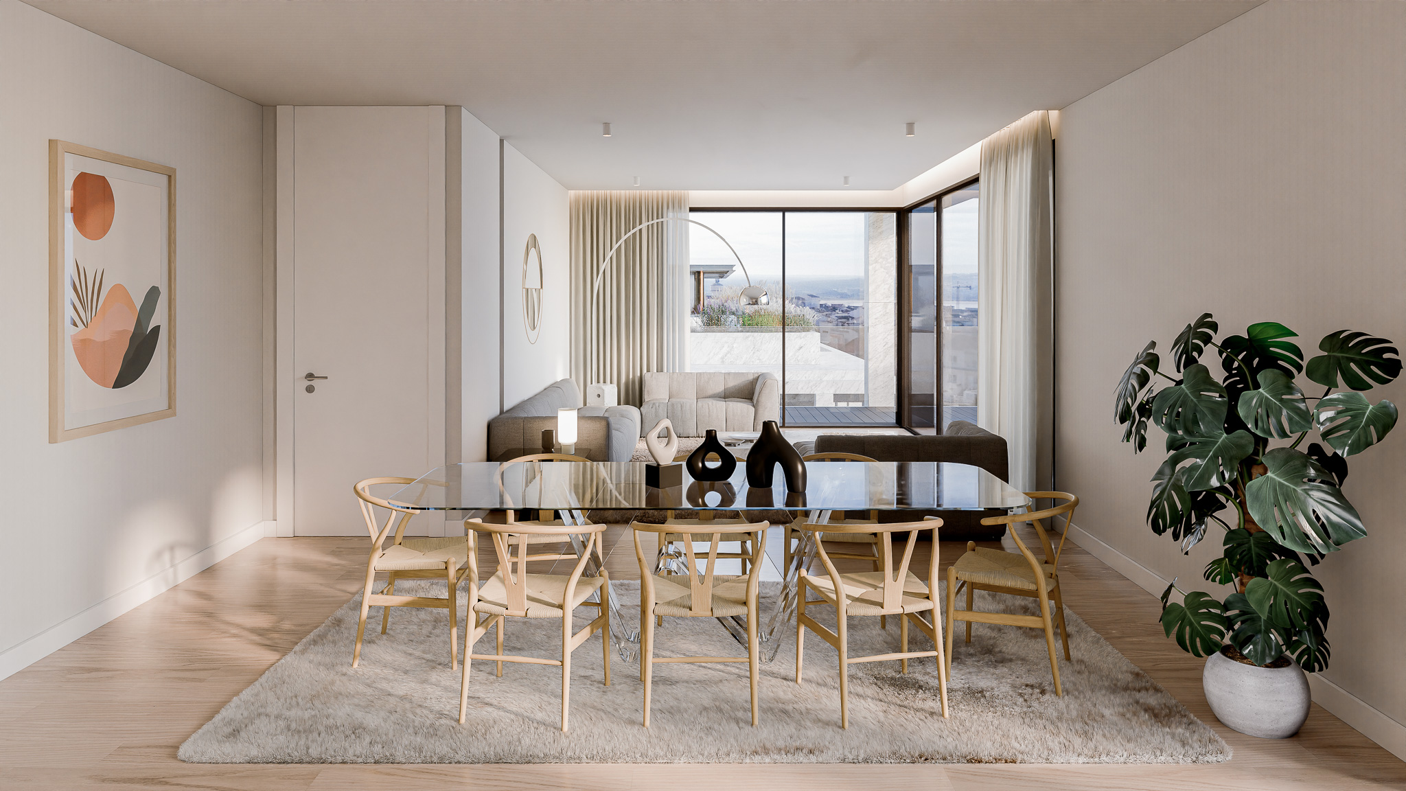 A expressão arquitetónica assenta na proporção e na clareza estrutural, com fachadas revestidas a mármore de acabamento jato de areia e varandas em madeira escura que introduzem contraste e temperatura aos planos negativos. O conjunto integra cinco piscinas – quatro privadas nos terraços e uma comum ao nível do logradouro – que prolongam o espaço habitacional para o exterior, reforçando a qualidade de vida e a ligação visual com a natureza.