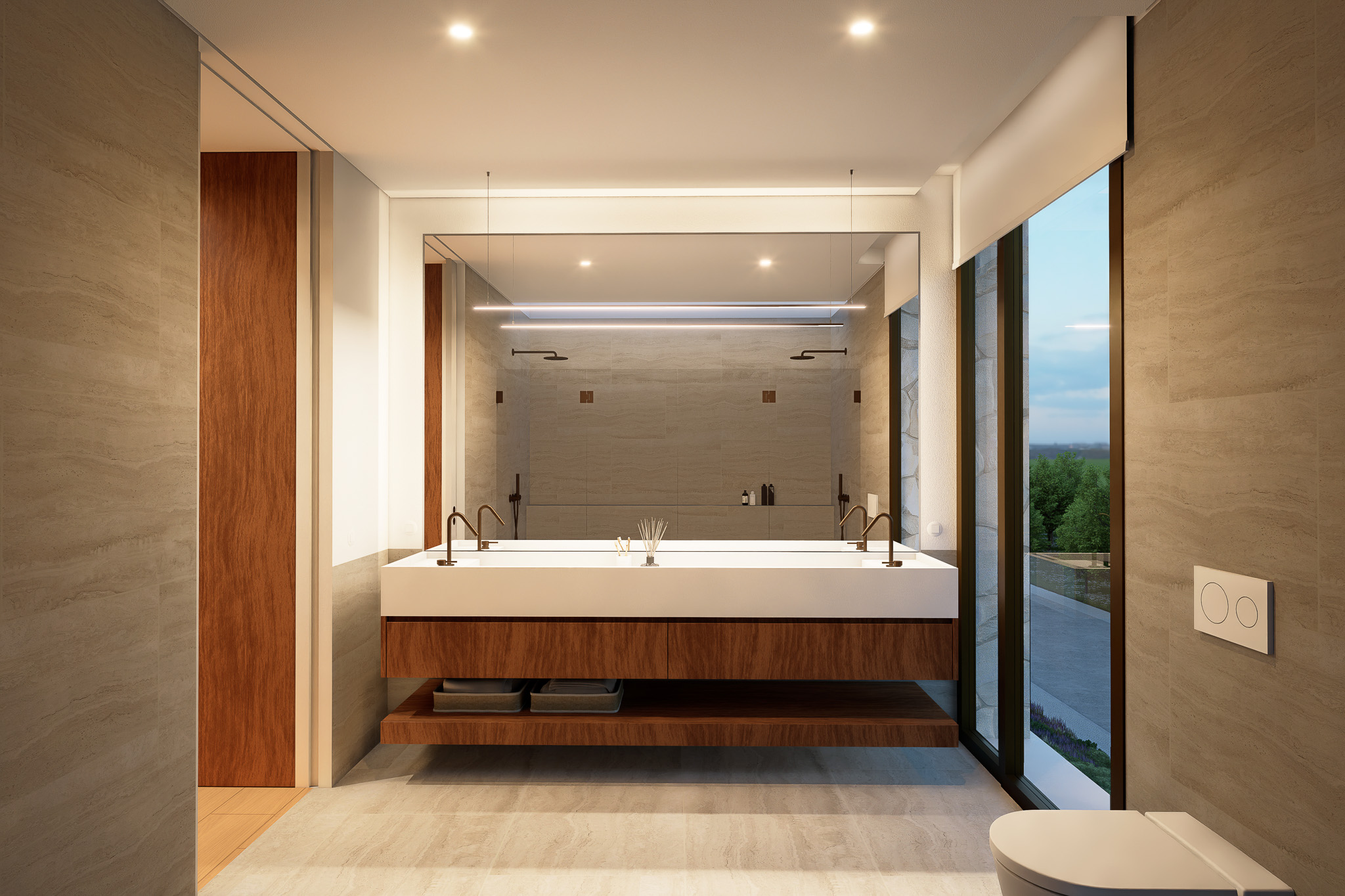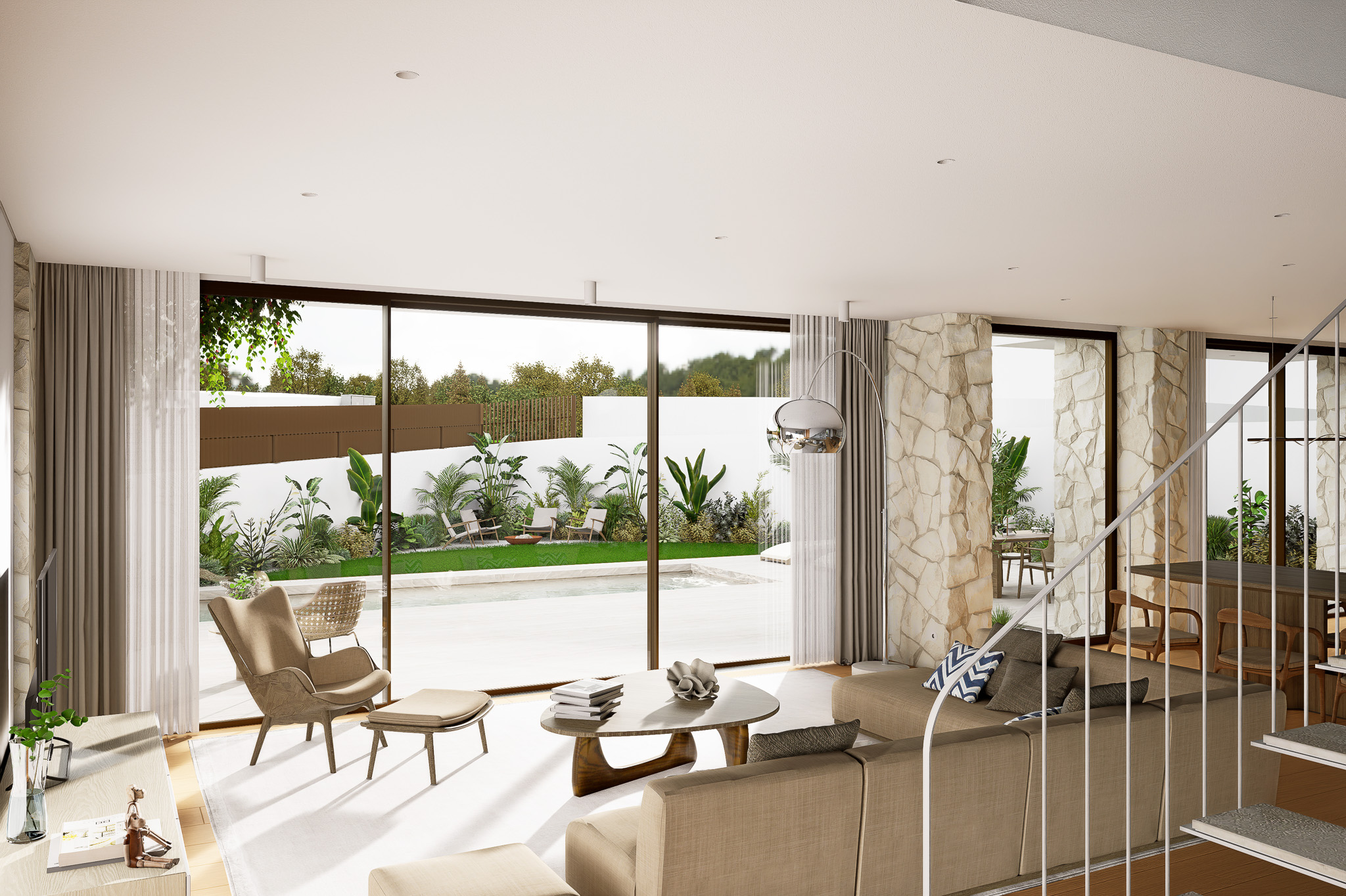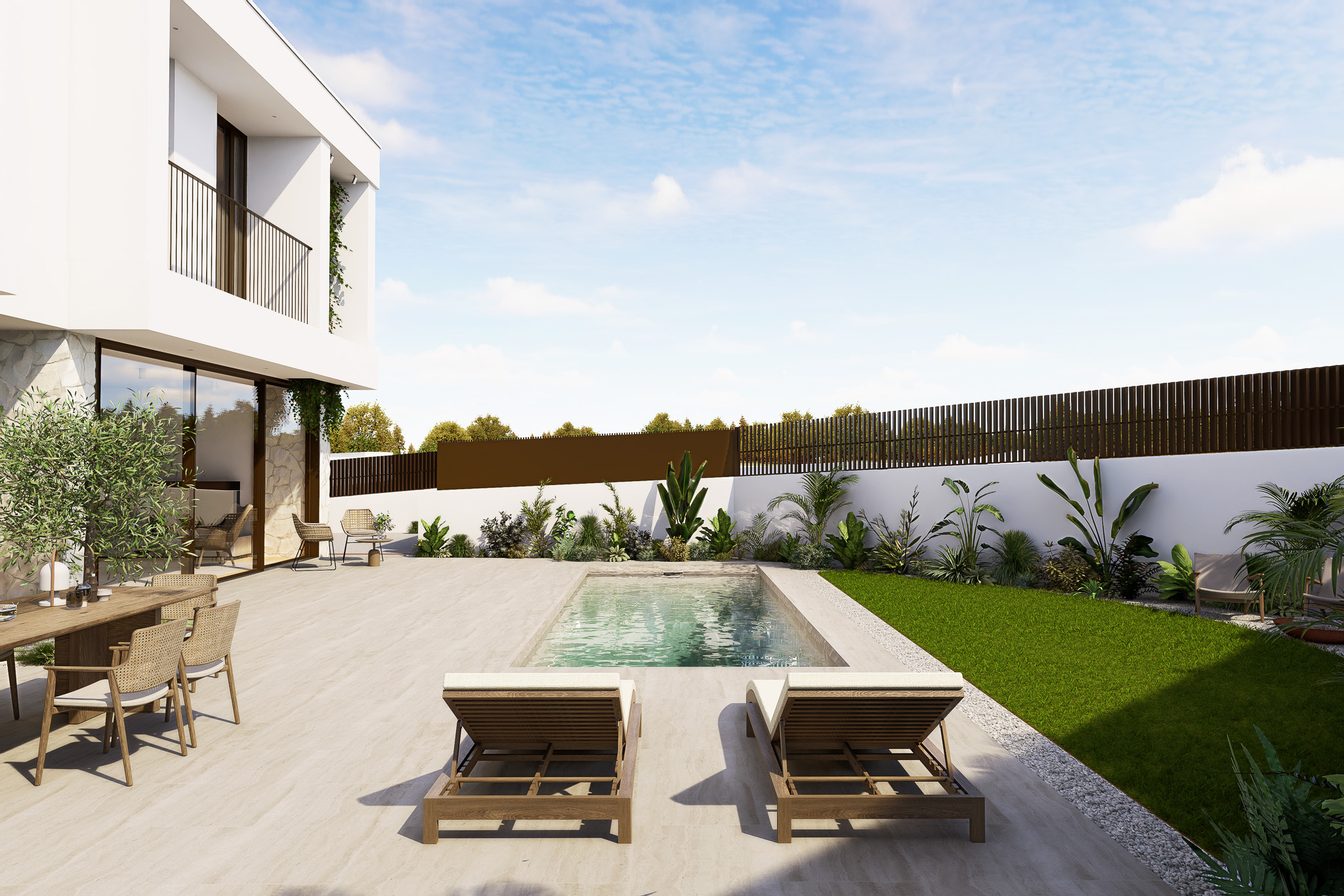A piscina, integrada de forma subtil no desenho do terreno, assume-se como o centro da vivência exterior – um espaço de descanso e lazer que reforça o diálogo entre arquitetura e paisagem. A luz natural, os materiais nobres e a paleta cromática suave contribuem para uma atmosfera serena e intemporal.