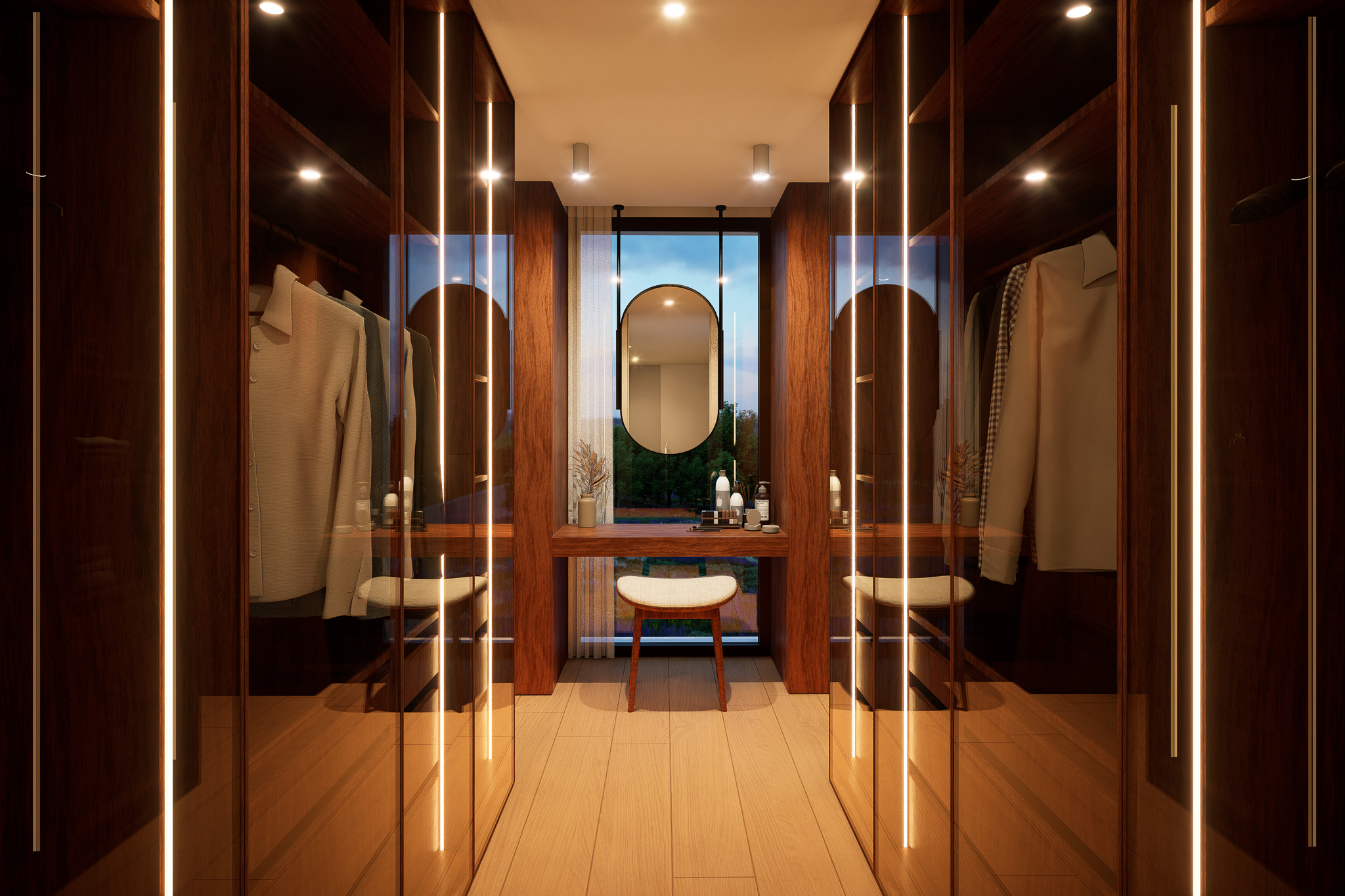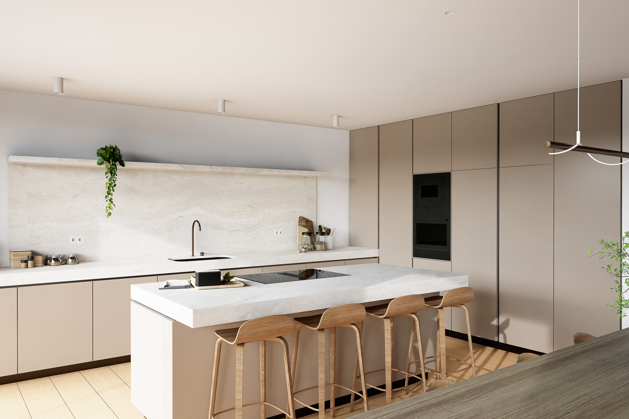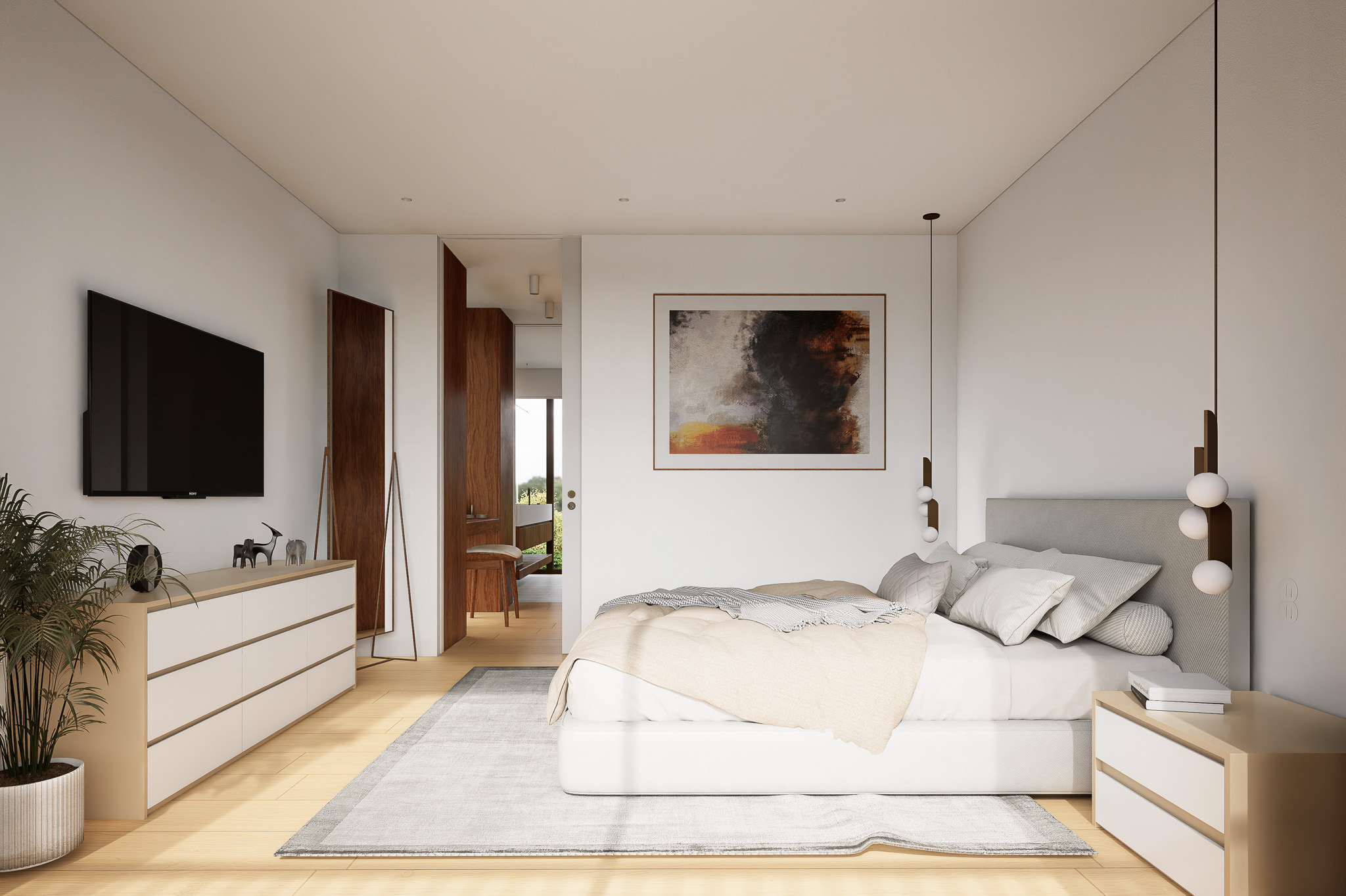 A piscina, integrada de forma subtil no desenho do terreno, assume-se como o centro da vivência exterior – um espaço de descanso e lazer que reforça o diálogo entre arquitetura e paisagem. A luz natural, os materiais nobres e a paleta cromática suave contribuem para uma atmosfera serena e intemporal.